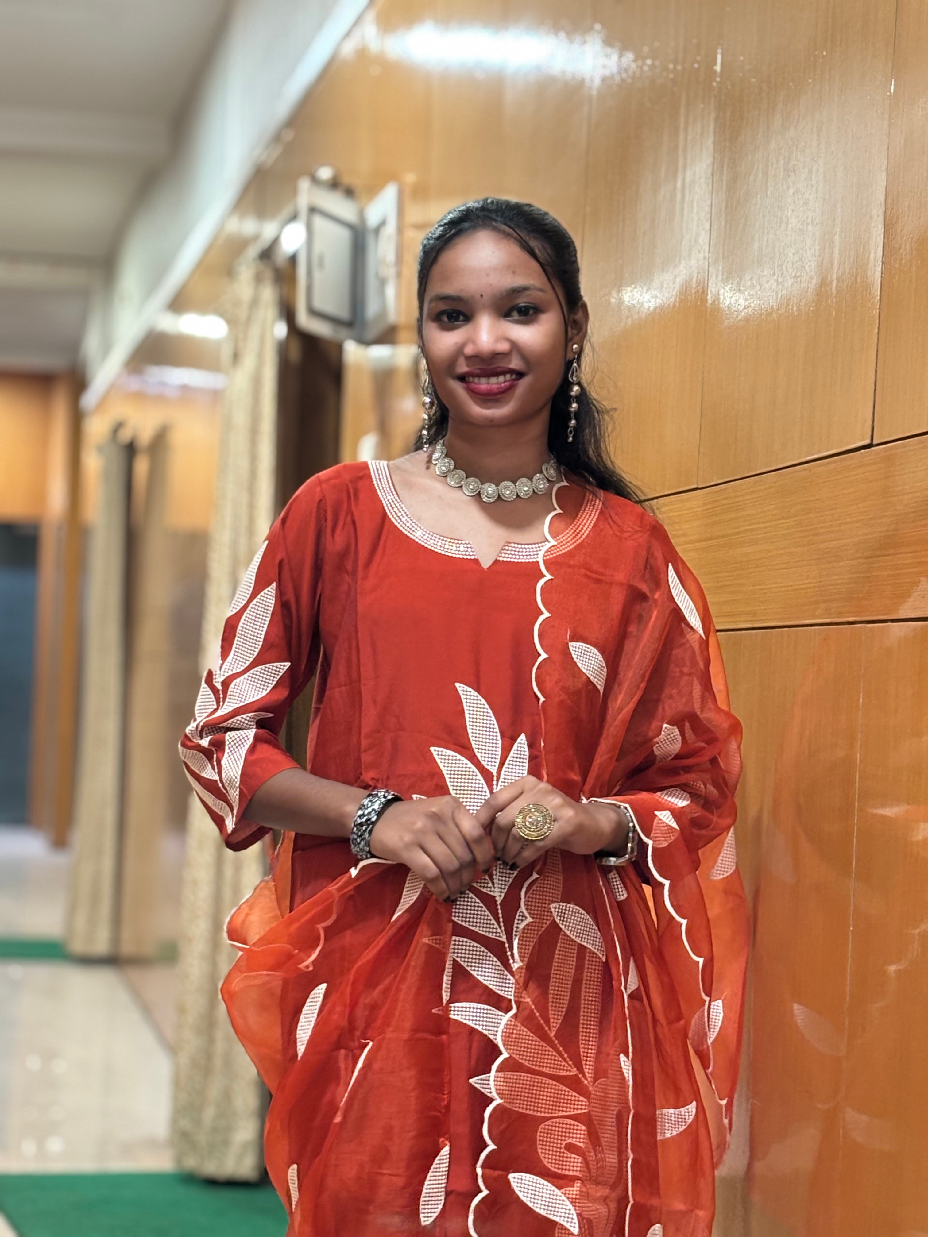Finished in a rich rust orange hue that flatters every skin tone, this suit set is perfect for festive gatherings, poojas, office wear, or sophisticated day outings.