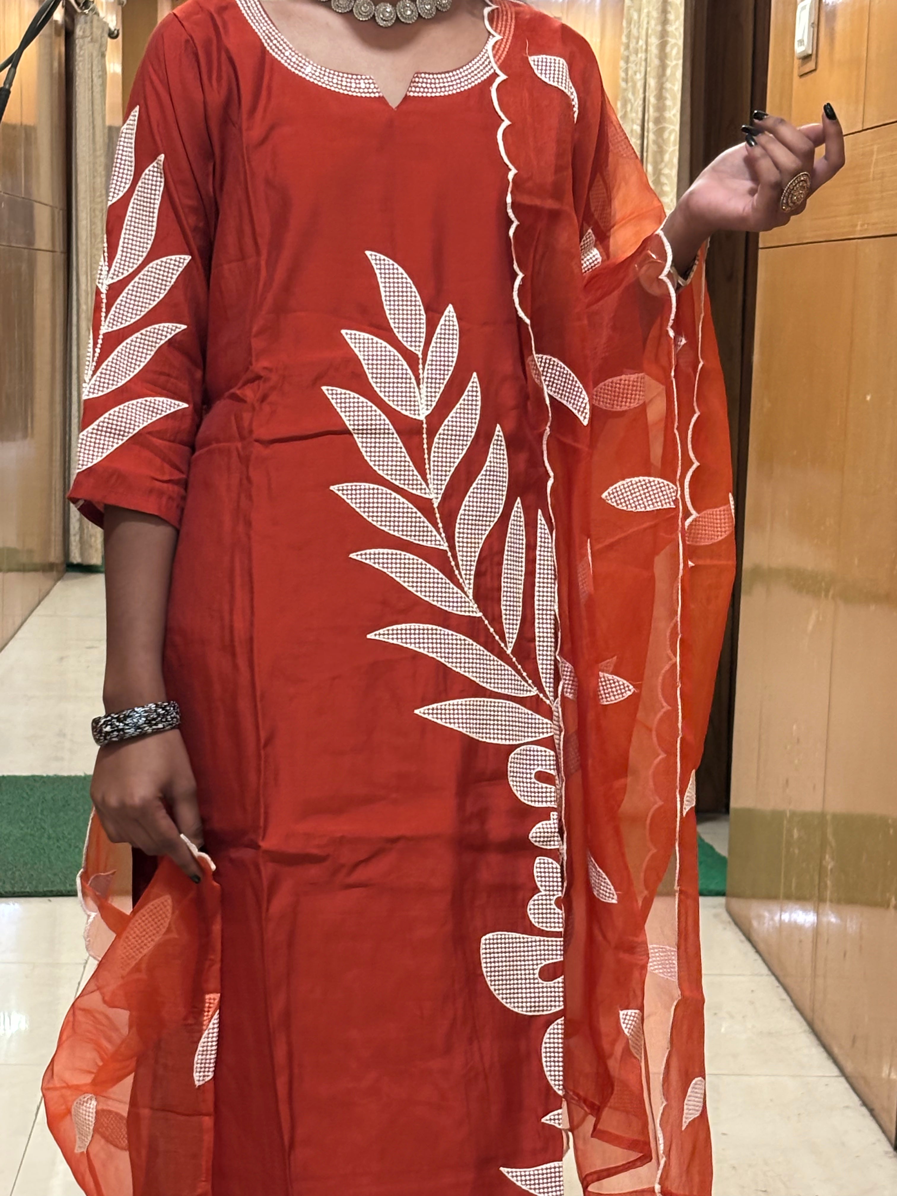 Rust Orange Muslin Embroidered Straight Suit Set with Dupatta